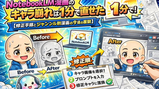AIツール & 使い方 NotebookLM漫画のキャラ崩れは1分で直せた【修正手順とジャンル別漫画の今後の展開】 2026年3月26日 hiroro-ailab https://hiroro-ailab.com/wp-content/uploads/2026/03/hiroro-header-1500x500-1.png HiroroのAIと副業ラボ こんにちは、Hiroroです。 前回の記事でお伝えした「5枚目のHiroroだけキャラが崩れていた問題」、さっそく修正しました。 …
