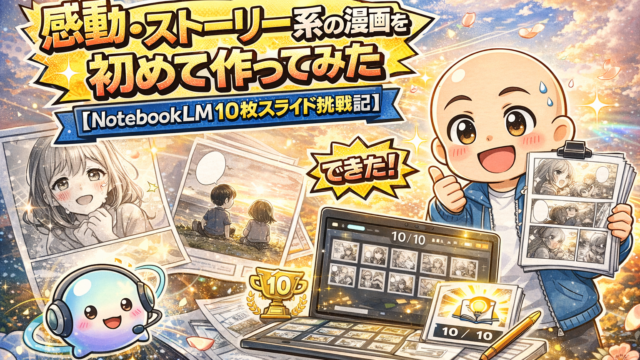 AI入門 「感動・ストーリー系の漫画を初めて作ってみた【NotebookLM 10枚スライド挑戦記】」 2026年3月27日 hiroro-ailab https://hiroro-ailab.com/wp-content/uploads/2026/03/hiroro-header-1500x500-1.png HiroroのAIと副業ラボ こんにちは、Hiroroです。 これまでNotebookLMのスライド漫画は「日常ギャグ・コメディ系」しか作ってきませんでした。 …