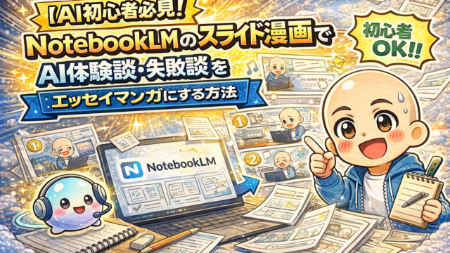 AIツール & 使い方 【AI初心者必見】NotebookLMのスライド漫画で AI体験談・失敗談をエッセイマンガにする方法 〜HiroroとラボちゃんのAI冒険日誌〜 2026年3月31日 hiroro-ailab https://hiroro-ailab.com/wp-content/uploads/2026/03/hiroro-header-1500x500-1.png HiroroのAIと副業ラボ 「ブログにもっと読みやすいコンテンツを入れたい」 「自分のAI体験談を漫画で伝えられたら面白そう」 「でも漫画なんて描け …