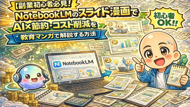 AIツール & 使い方 【副業初心者必見】NotebookLMのスライド漫画で AI×節約・コスト削減を教育マンガで解説する方法 〜月1万円以上の削減をHiroroとラボちゃんがQ&A漫画でわかりやすく解説 2026年4月1日 hiroro-ailab https://hiroro-ailab.com/wp-content/uploads/2026/03/hiroro-header-1500x500-1.png HiroroのAIと副業ラボ 「副業を始めたいけど、ツール代や外注費が怖い......」 「AIで節約できるって聞くけど、何をどう使えばいいの?」 「 …