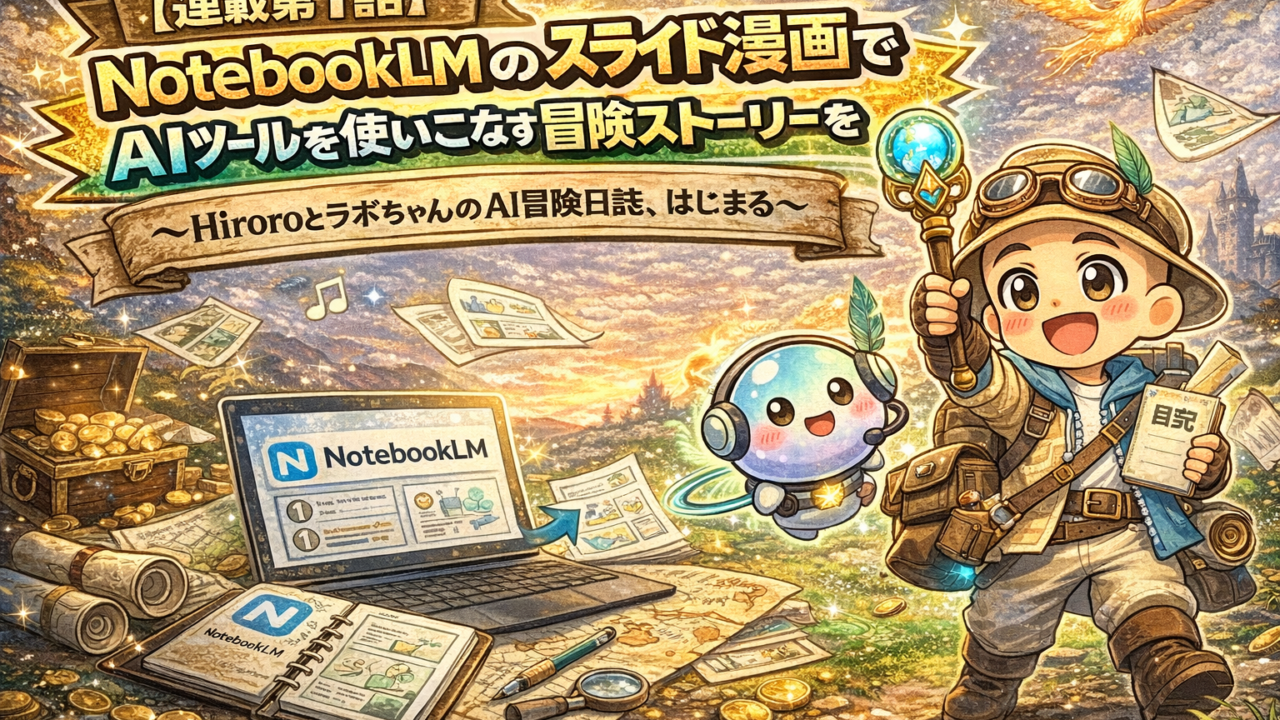 そんな想いを叶えてくれるのが、NotebookLMのスライド漫画を使ったストーリー系コンテンツです。 HiroroとラボちゃんのAIツール冒険シリーズは、「AIツールの島を制覇する旅」という世界観の中で、AIの使い方・副業の知識・失敗と成長をストーリーとして届けます。 この記事では、第1話「ラボちゃんとの出会い、冒険のはじまり」の作り方を、NotebookLMでの生成手順からブログへの組み込み方まで完全解説します。