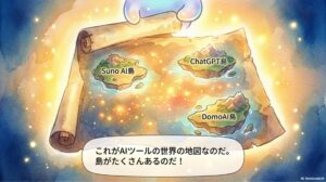 舞台:「AIツールの世界」。現実と似ているが、AIツールがそれぞれ「島」として存在する。 登場する島の例:Suno AI島・ChatGPT島・DomoAI島・NotebookLM島……